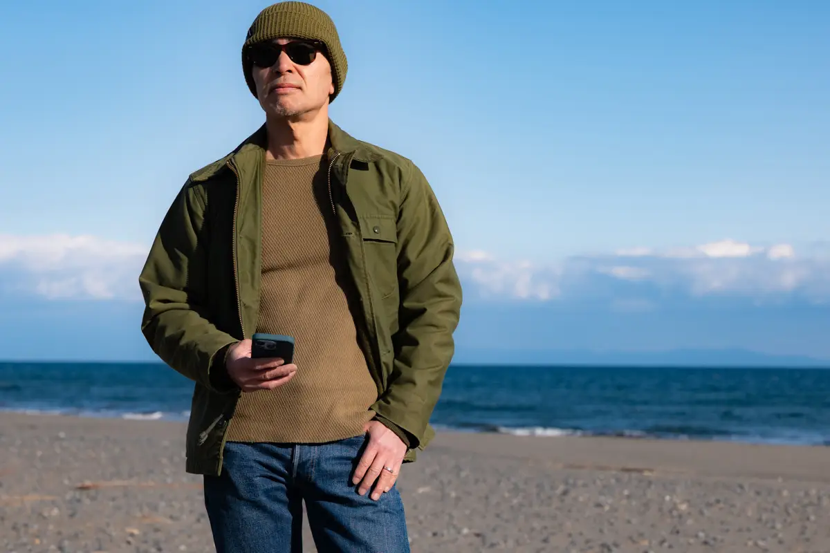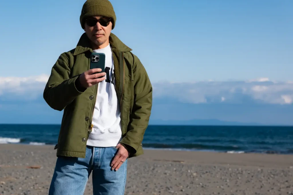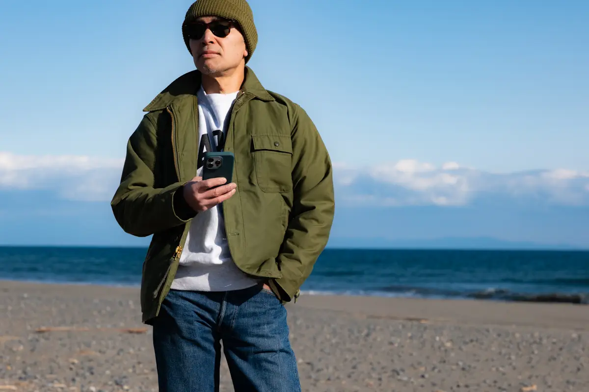For younger individuals, opting for the oversized A2 Deck Jacket – itself a trend – and pairing it with loose-fit innerwear and bottoms can still create a clean silhouette. However, for those of a certain age, an oversized silhouette can appear sloppy. Therefore, we recommend wearing it in a size that fits well.