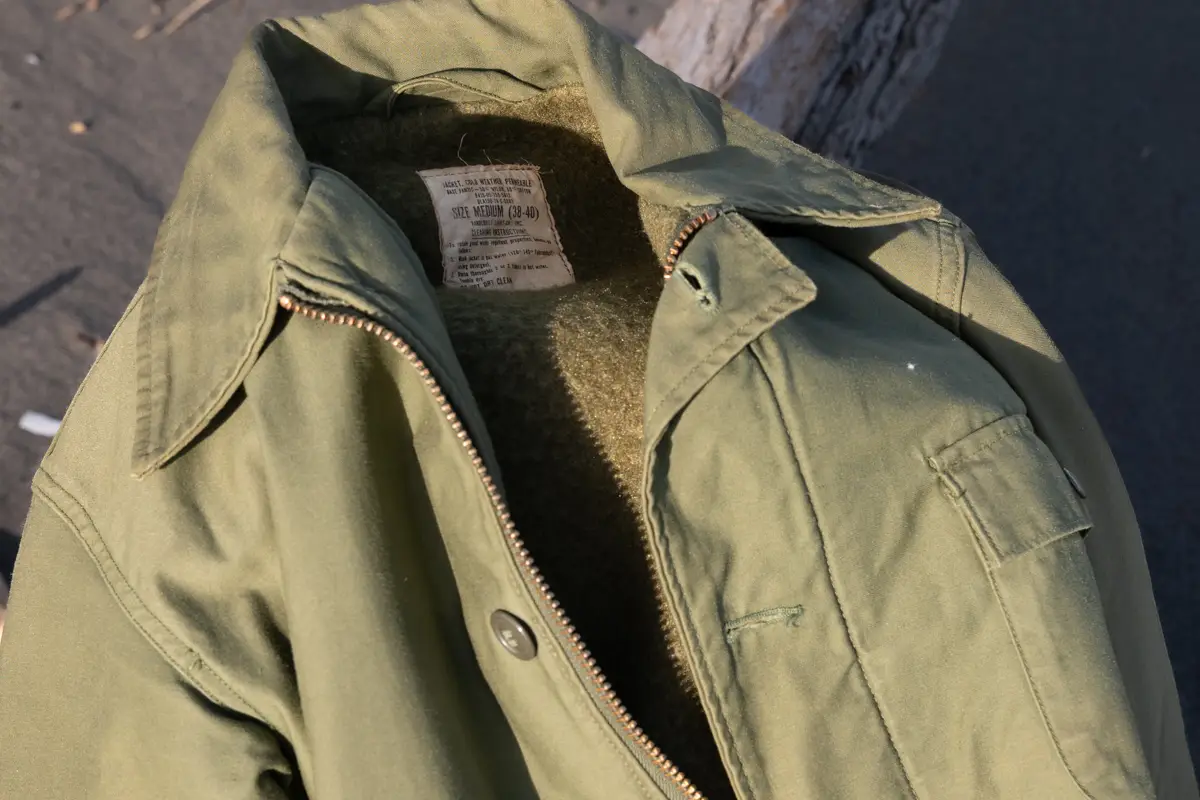 In contrast to the M65, designed for combat wear and built on the premise of infrequent donning and doffing to adapt to changing environments, this deck jacket is intended for continuous wear during deck work. It is designed to withstand the cold of deck duties, hence the acrylic fleece lining.