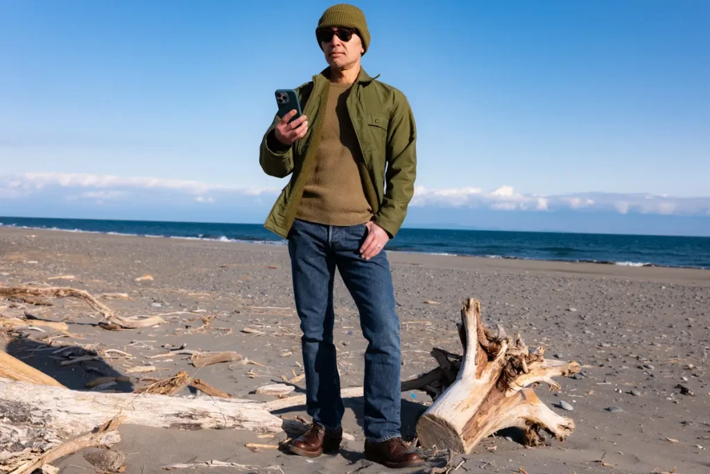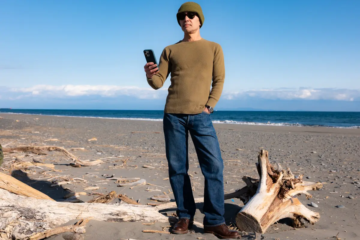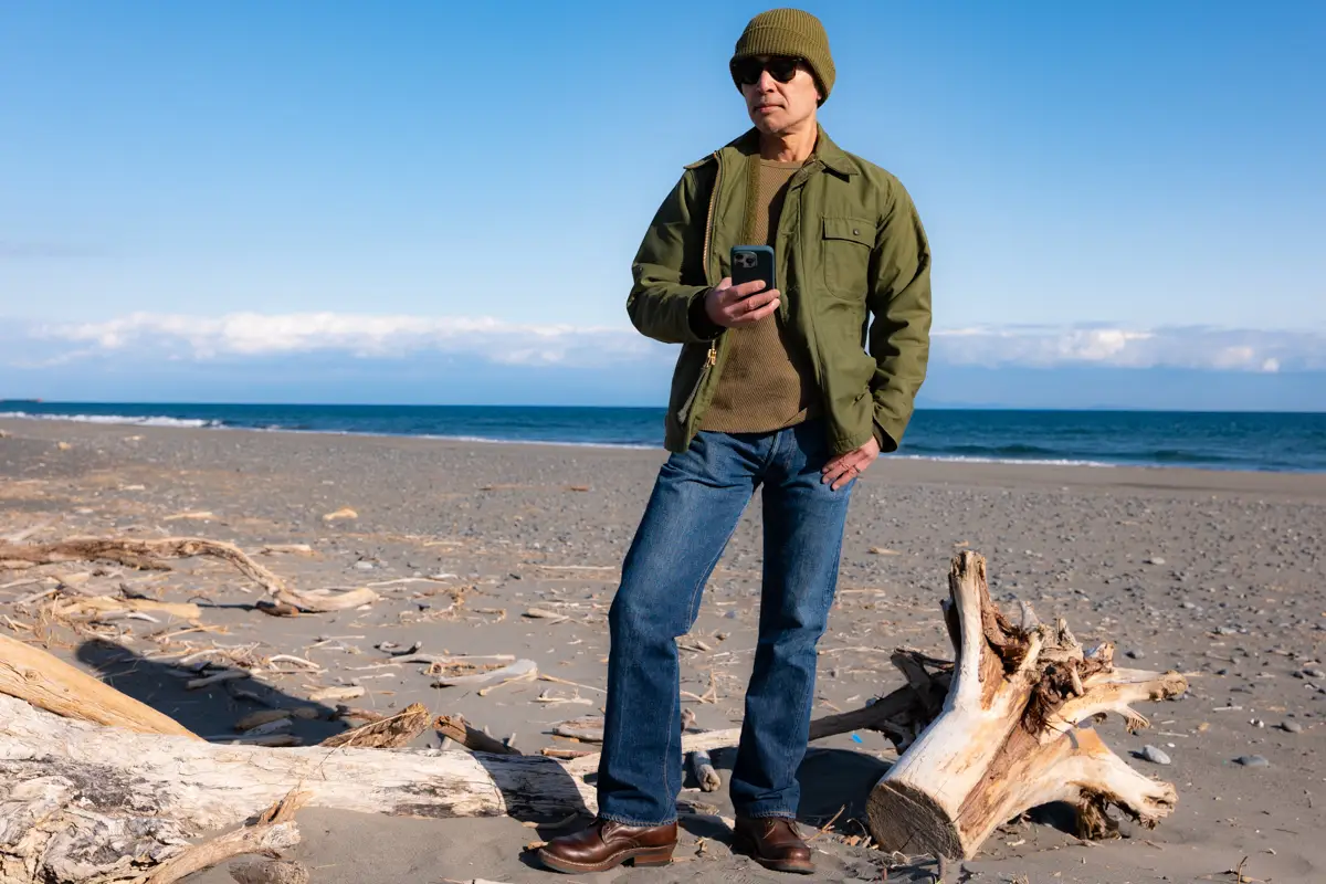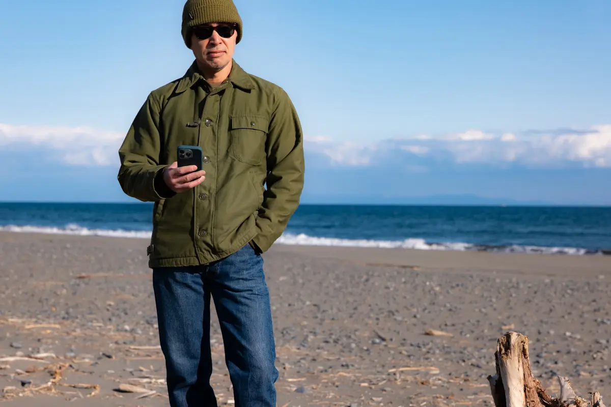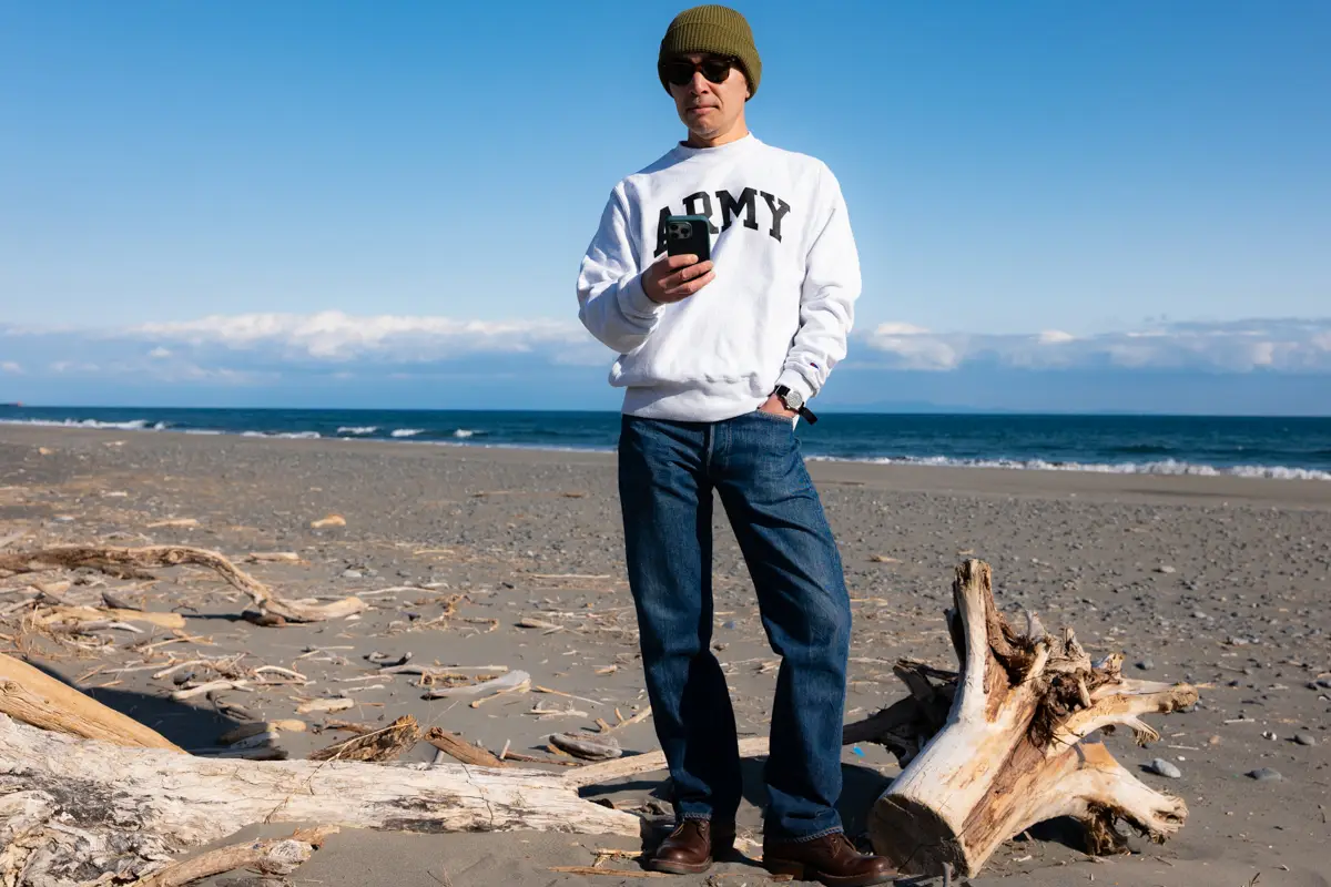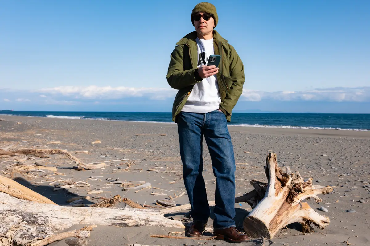 The denim is Levi’s 501XX, the inner layer is Champion’s Reverse Weave, and I’ve paired it with White’s semi-dress shoes. The combination of an A2 deck jacket and sweatshirt is a classic American casual look, so it’s a style worn by many, not just myself.