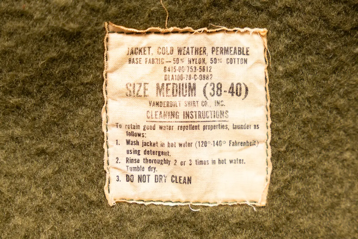 The A2 deck jacket features a tag attached to the inner neck area. Examining this tag reveals details such as the year of US military issue and the size. The number DLA-100-78-C-9882 shown on the tag image below is the contractor information (delivery details), where the “78” in 100-78 indicates the year of manufacture.