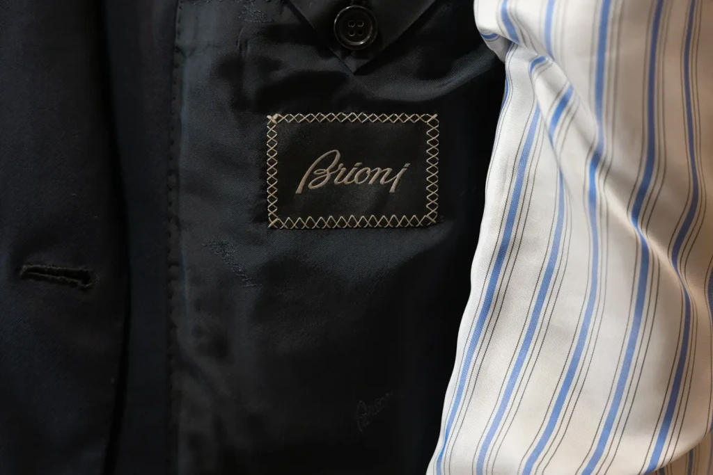 A simple, understated Brioni logo marks the interior. While this is an “all-season” orthodox suit, the details reveal the house’s uncompromising standards: it is fully lined, with a striking blue-striped silk fabric used for the sleeve linings. These discreet touches are the hallmark of Brioni—a commitment to excellence that only the wearer truly knows.