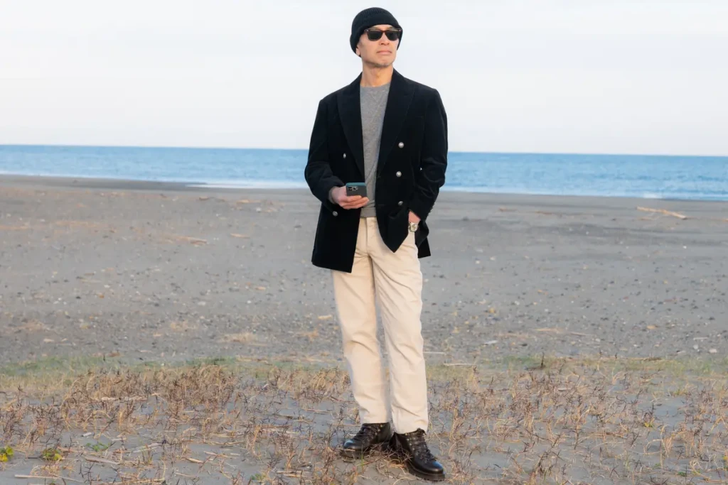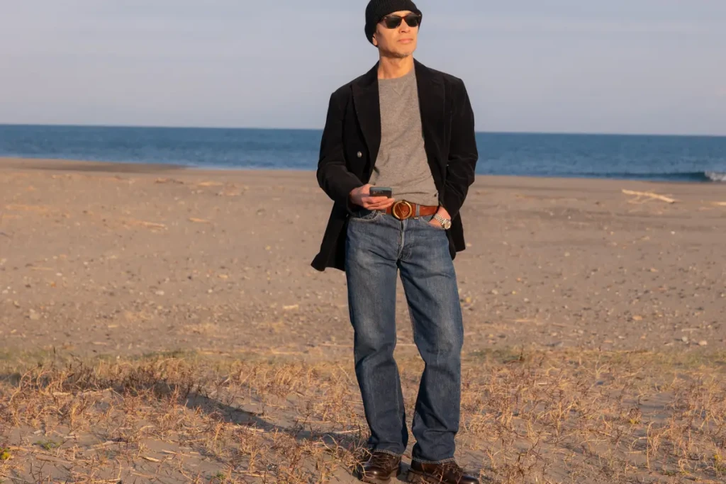 This time, I paired a Brunello Cucinelli corduroy jacket with vintage 501 jeans and Brunello Cucinelli bottoms. Comparing the photos taken, pairing the top and bottom with Brunello Cucinelli still creates a cleaner, more refined look.