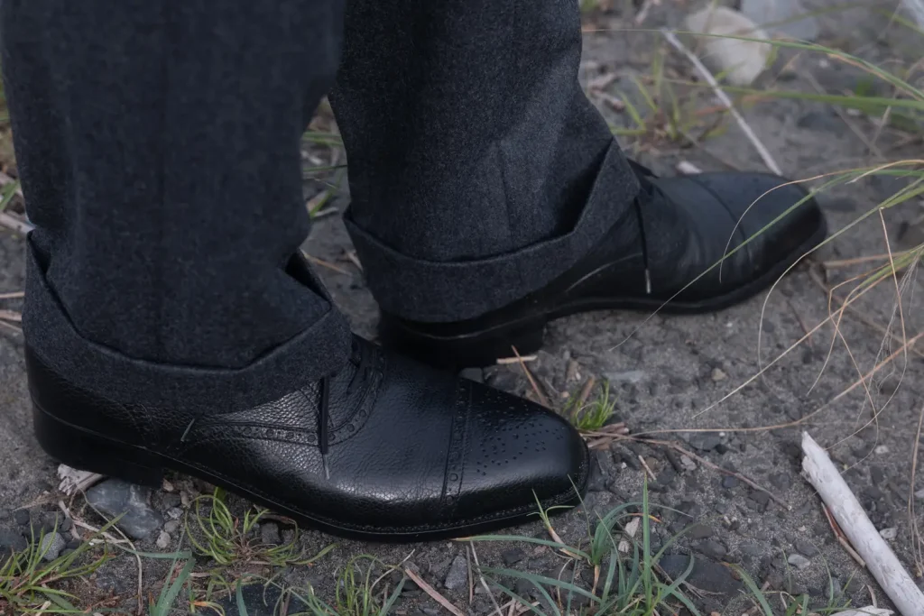 With the Brioni trousers, I wear Marini’s semi-brogue oxford. Both are Rome ateliers, so they share a register naturally — and the small brogueing keeps the look from going as severely formal as a plain cap-toe would, which is why these get worn often.