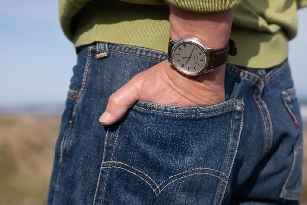 I rarely wear a leather-strap watch with the 501XX, but the Richard Lange is, strictly speaking, not a dress watch — it’s a wristwatch built as an homage to the precision regulators and observation watches of an earlier era, and that instrument quality lets it sit with denim without feeling forced. I tend to wear it this way when there are leather shoes on my feet.