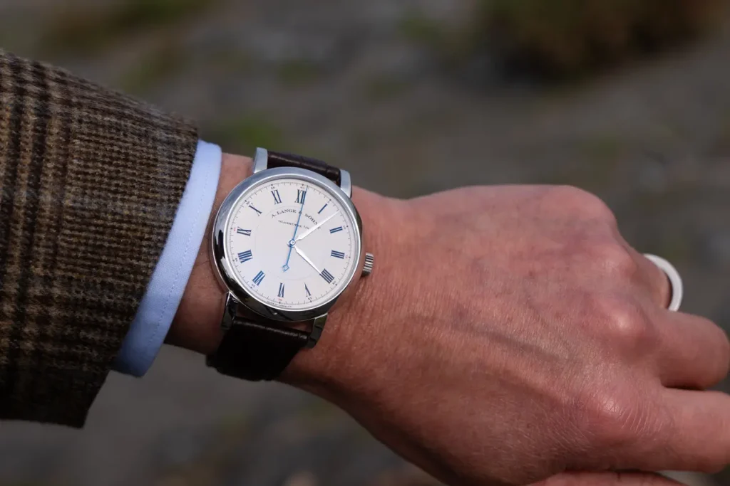 I’m wearing the platinum Richard Lange. Left to my own preferences, I’d have chosen the white-gold case with all three blued-steel hands — I’m partial to blued steel. But because my wife chose the pink-gold case, with solid pink-gold hour and minute hands, I matched her by going with the platinum case, whose hour and minute hands are solid white gold.