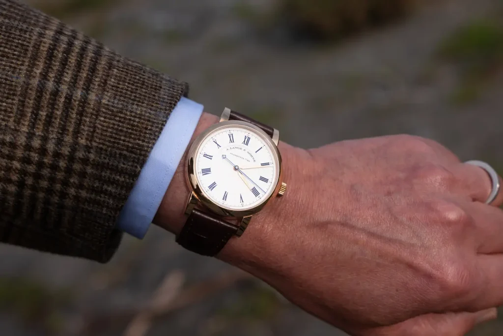 My wife’s pink-gold Richard Lange. It runs a little large for a woman’s wrist, but my wife was an athlete in her younger years and has the hand to carry a men’s watch without it looking out of place — which is why we settled on the Richard Lange.